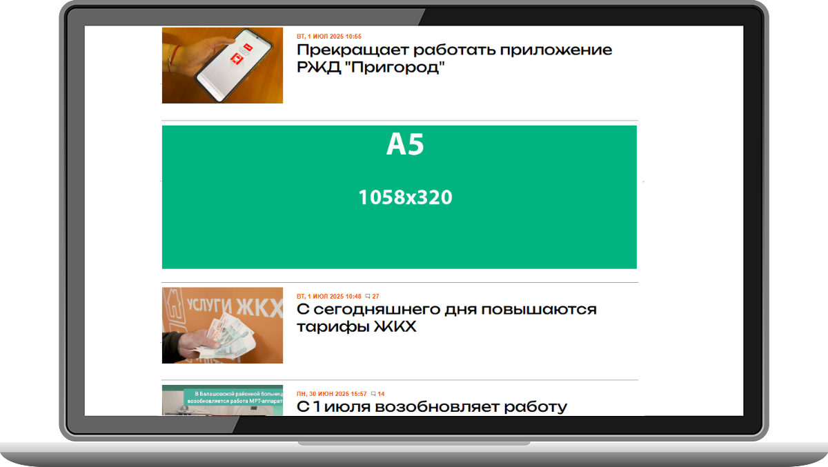 Баннер A5 - имеет размер 1058х320рх в десктоп-версии сайта и 320х320 в мобильной. Размещается после 10ой новости основной ленты новостей.